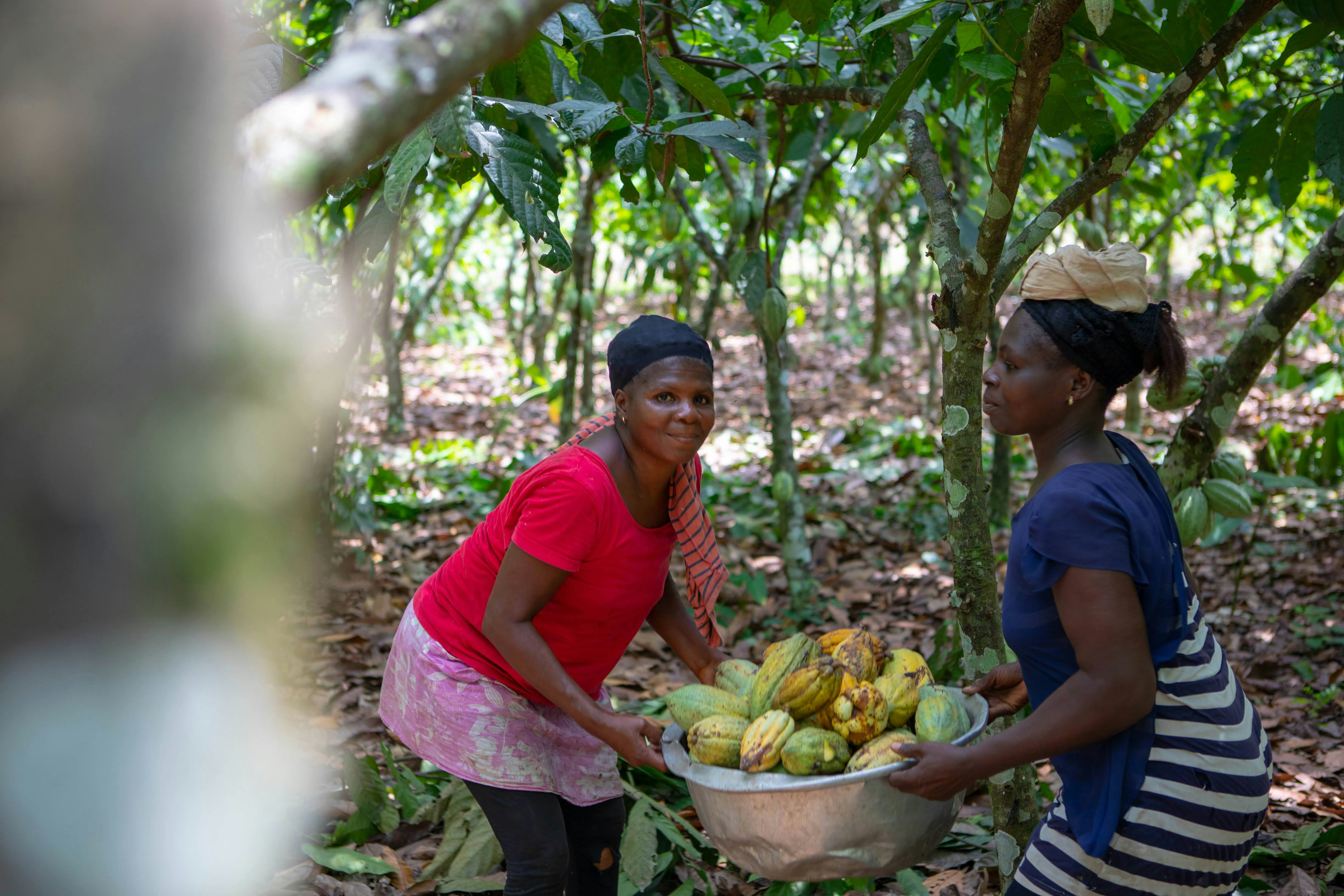Die geernteten Kakaoschoten werden in großen Schalen gesammelt. Teamarbeit ist bei diesem Prozess sehr wichtig. Die Bäuerinnen arbeiten oft zu zweit, erzählen sich Geschichten und singen gemeinsam, während sie die Früchte sammeln. Bei diesen Partnerschaften geht es nicht nur um die Produktivität, sondern auch um die kameradschaftlichen Bindung, die sich zwischen den Bäuerinnen entwickeln.